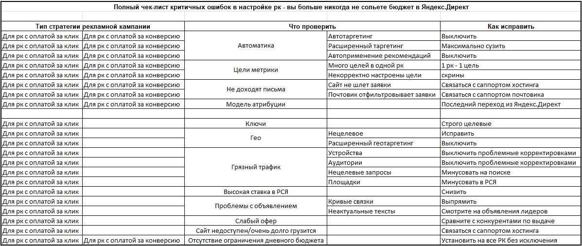 Я не прошу верить мне на слово. Если вы узнаете в рассматриваемой мною ситуации свою, просто проверьте ее по моему чек-листу, и вы обязательно найдете ошибки. Исправьте их все (это важно!), потому что даже одна критичная ошибка запросто может руинить работу в остальном идеально настроенной рекламной кампании. И всего лишь одной рк, в которой настройками не закрыта возможность нецелевого расхода средств, достаточно, чтобы парализовать работу всего аккаунта. Если исправили все – проблема 100% решится.