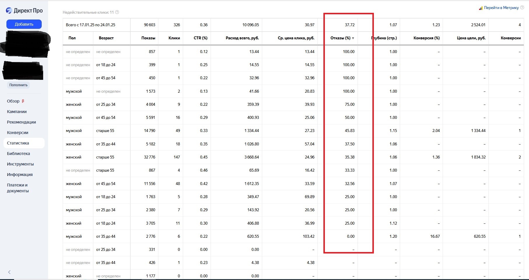 Если какие-то сильно выделяются % отказов и при этом имеют достаточно много кликов, чтобы оказывать заметное негативное влияние на общую статистику, отключаем их – делаем корректировку -100% на странице настройки рк или группы кампаний.